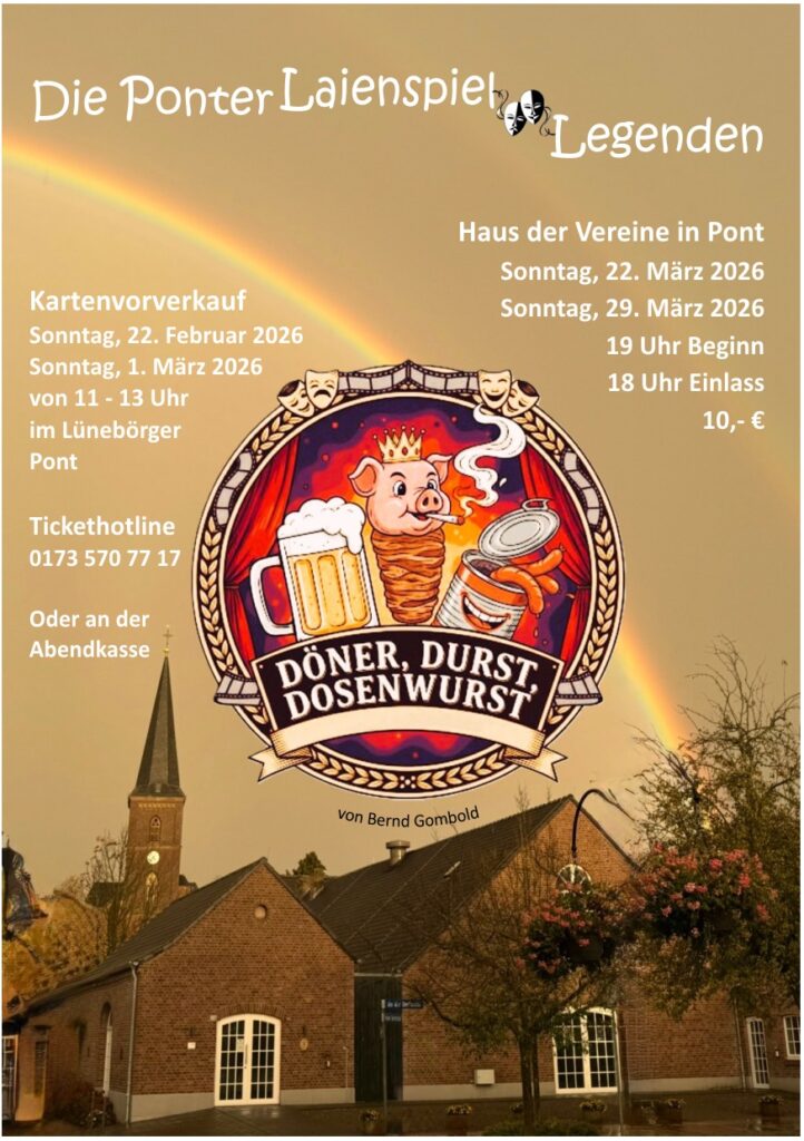 Achtung, aufgepasst! Auch in 2026 betreten die Ponter Laienspiel Legenden wieder die Bretter, die die Welt bedeuten. Mit Döner, Durst und Dosenwurst steht ein Schwank von Bernd Gombold zur Aufführung an. Datum und Uhrzeit 22.03.2026 bzw. 29.03.2026, Einlass: 18:00 Uhr, Beginn: 19:00 Uhr Veranstaltungsort Haus der Vereine, An der Dorfwiese, 47608 Geldern Tickethotline 0173 5707717 oder an der Abendkasse Vorverkauf Wo: Gaststätte ‚Zum Lünebörger‘, Venloer […]