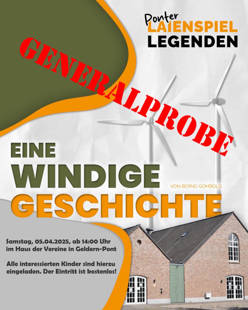 ACHTUNG! Am Samstag (05.04.2025) findet ab 14:00 Uhr die Generalprobe zu „Eine windige Geschichte“ statt. Die Ponter Laienspiel Legenden laden hierzu interessierte Kinder herzlich ein. Der Eintritt für die Kids ist kostenlos!